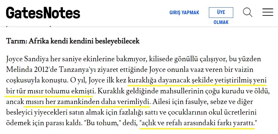 Etkinlikten hemen bir gün önce 21 Ocak’ta Bill ve Melinda Gates Vakfı’nın 2015 ‘Yıllık Mektubu’ yayınlanmış. Mektupta 2030 senesi için ‘büyük bahsimiz’ olarak bahsedilen husus fakir ülke insanlarının yaşamlarının önümüzdeki 15 sene içerisinde, tarihin herhangi bir zamanına kıyasla, daha hızlı iyi hale gelebileceğinden bahsedilmiş. 2030’a kadar gerçekleşmesini umdukları bu ‘iyi yaşam’ ideali için öngördükleri atılımlar arasında genetiği değiştirilmiş gıdalardan direkt olarak bahsetmiyorlar. Ancak Bill Gates’in videoda da bahsettiği ‘Afrika ve tarım’ konsepti Yıllık Mektup’un bir kısmında geçiyor.