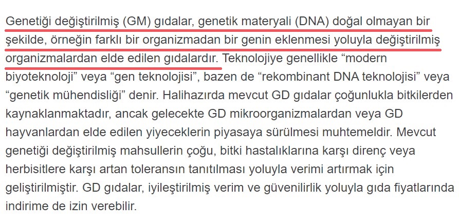 Bu noktada ‘genetiği değiştirilmiş gıdaları’ tanımlamakta fayda var. Dünya Sağlık Örgütü’ne göre bu ürünler, genetik materyali (DNA’sı) yapay şekilde değiştirilen organizmalardan elde edilen gıdalardan oluşuyor. Örnek olarak kendisinden farklı bir organizmadan eklenen gen veya genler içeren gıdalar gösterilebilir.