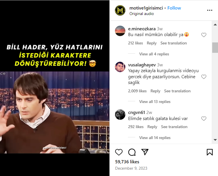 Geride bıraktığımız Aralık ayında, sosyal medyada Amerikalı oyuncu Bill Hader’ın yüzünü farklı oyunculara ‘dönüştürdüğü’ bir video paylaşıldı. Hader’ın, videoda sırasıyla Al Pacino, Tom Cruise ve Arnold Schwarzenegger’a dönüştüğü görülüyor. ‘Bill Hader yüzünü değiştiriyor’ başlığıyla internet taraması yapıldığında iddia 2019 yılına dek takip edilebiliyor.