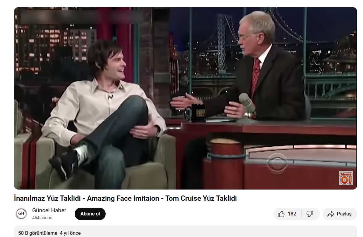 Videodan alınan ekran görüntüleri, tersine aratıldığında üç ayrı videoya ulaşılıyor. Hader’ın Al Pacino, Tom Cruise ve Arnold Schwarzenegger’e dönüştüğü üç videonun da ‘Ctrl Shift Face’ isimli YouTube kanalından 2019’da paylaşıldığı görülüyor. Ctrl Shift Face, video başlıklarına [DeepFake] ifadesi eklemiş.