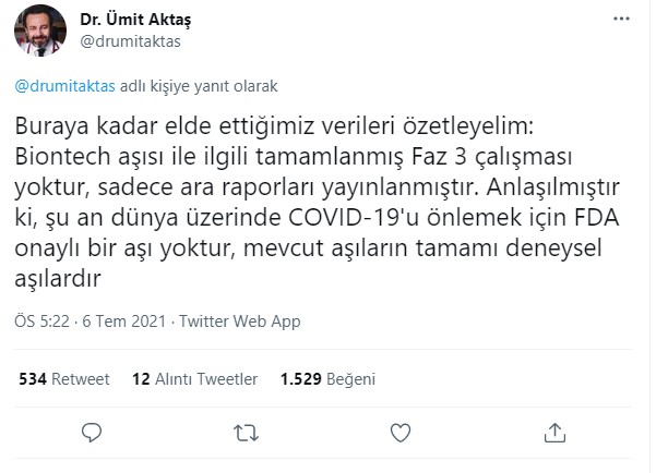 Twitter’da yer alan “Dr. Ümit Aktaş” isimli hesap paylaşımlarında BioNTech aşısının Türkiye’de acil kullanım onayı almadığını ve bu aşının Faz-3 çalışmalarının tamamlanmadığını iddia etti. Kanıt olarak ise Pfizer firmasından aldığı maili göstermektedir. Ekran görüntüsünün paylaşıldığı bu mailde Pfizer firması Türkiye’de BioNTech aşısına acil kullanım onayı verilmediğini söylemiştir. Mailde ABD Gıda ve İlaç Kurumu (FDA)’nin acil kullanım onayı verdiği belirtilmiştir. “Dr. Ümit Aktaş” ise FDA’nın Türkiye’de bağlayıcılığı olmadığını söylemektedir. “Dr. Ümit Aktaş” aynı zamanda aşının 3. Faz çalışmalarının tamamlanmadığını iddia etmektedir. Buna kanıt olarak Pfizer yayınladığı prospektüsünü ve FDA’nın yayınladığı yazıyı göstermiştir. İddia pek çok Twitter hesabı tarafından da paylaşıldı.