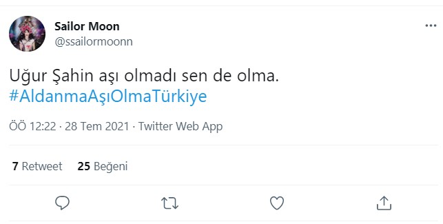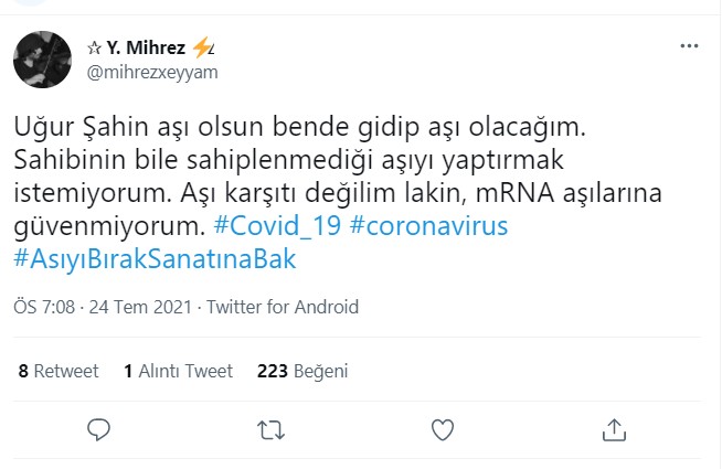 Twitter’da pek çok hesap paylaşımlarında BioNTech’in kurucuları olan Özlem Türeci ve Uğur Şahin ’in Covid-19 aşısını olmadığını iddia etti.  Özellikle aşı karşıtları bunu öne sürerek aşının güvenli olmadığını söylemektedir. 27 Mayıs 2021 tarihinde Dr. Ender Saraç ile Sağlıklı Günler programının 123.bölümünde de Uğur Şahin’in aşı olmamasının nedeni konuşulmuştur. Aşağıdaki videoda (22:08) bunu görmek mümkün.