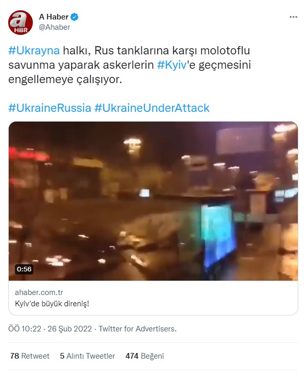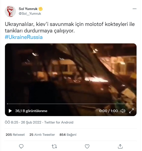 Rusya-Ukrayna çatışması ile ilgili sosyal medyada paylaşılan videolardan birisinde, bir araca molotof atıldığı görülüyor. Videoda Rusya’nın Kiev’e saldırısı sonucunda, sokakları dolduran Ukrayna halkının tanklara molotof attığı iddia ediliyor. İddiayı pek çok kullanıcı paylaşıyor. Yeniçağ, Haber Türk, Yeni Akit, A Haber gibi pek çok haber mecrası da bu iddiayı haber olarak yayınladı.