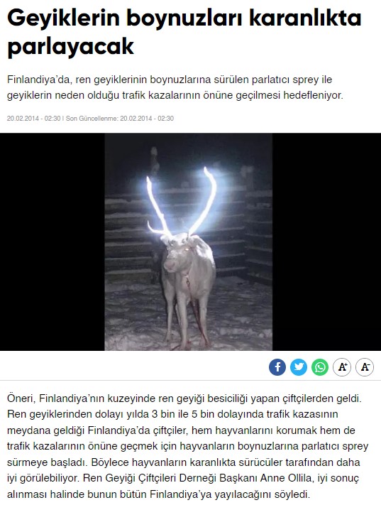 İddiayla ilgili araştırma yapıldığında, 2014 yılında Finlandiya’da ren geyiği besiciliği yapan çobanlar tarafından bir öneri ortaya atıldığı anlaşılıyor. Finlandiya Ren Geyiği Çobanları Derneği, trafik kazalarına çözüm olması için geyiklerin boynuzlarına parlatıcı sprey boyalar sürülmesini önermiş. Bu uygulamayla hem trafik kazalarının önüne geçmek hem de geyiklerin korunması amaçlanmış. Dünya basınında kendine yer bulan konunun, Türkiye’de de gündeme geldiği görülüyor.