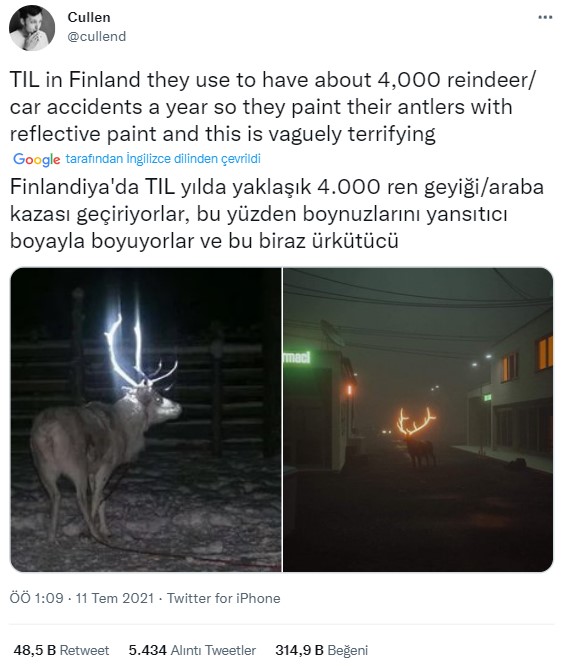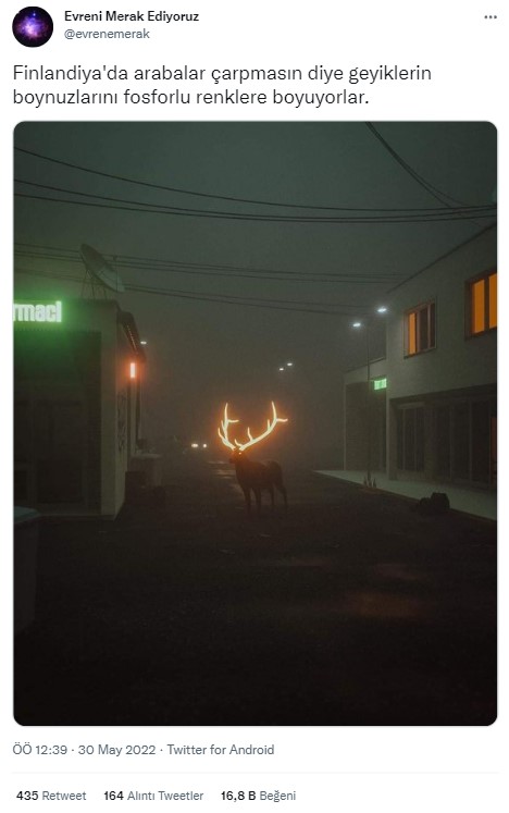 Karşılaştığımız bir Tweette “Finlandiya’da arabalar çarpmasın diye geyiklerin boynuzlarını fosforlu renklere boyuyorlar” ifadesiyle fotoğraf paylaşıldı. Fotoğraf, dünyada da pek çok kez paylaşılmış. Sosyal medya kullanıcıları bu fotoğrafın gerçek olduğunu düşündü.