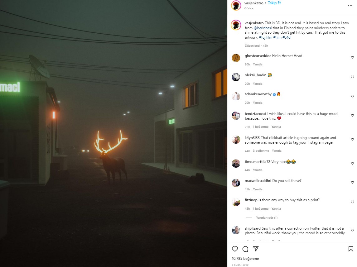 Görsel tasarım sanatçısı olan Katro, 6 Şubat 2020’de iddialara konu olan fotoğrafı paylaşmış. Fotoğrafın paylaşım notunda, “Bu çalışma 3D.Gerçek değil. Finlandiya’da geceleri parlaması için yağmur geyiklerinin boynuzlarını boyarlar, böylece arabalar çarpmaz. Bu beni bu sanat eserine götürdü” ifadeleri yer alıyor.