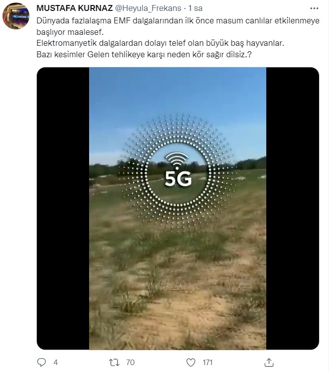 Twitter’da bir kullanıcının paylaştığı video kısa sürede binlerce görüntülenme almıştı. Söz konusu videoda yerde duran onlarca inek görülmekte. Videoyu paylaşan kullanıcı, toplu inek ölümünün elektromanyetik 5G dalgaları etkisiyle gerçekleştiğini iddia etmiş. Bazı yabancı iddia kaynaklarında video paylaşılmış fakat, video açıklamasında bu duruma neyin sebep olduğu belirtilmemiş.