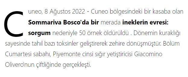 Quotidiano Nazionale’nin haberine göre olay, İtalya’nın Cuneo bölgesinin ‘Sommariva del Bosco’ kasabasında gerçekleşmiş. Haberde, 50 büyükbaş hayvanın İtalyan çiftçi Giacomino Olivero’ya ait olduğunu anlıyoruz. Olivero haberde, hayvanların Sorghum adlı bir yemle beslendiğini belirtmiş. Çiftçi söyleminin devamında, bu yemin bazı durumlarda ölümcül olabileceğine vurgu yapmış. Sorghum’un hidrojen, siyanür gibi toksik madde ürettiğini, hayvanların bu sebeple telef olduğunu söylemiş.