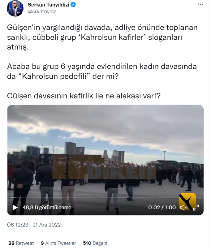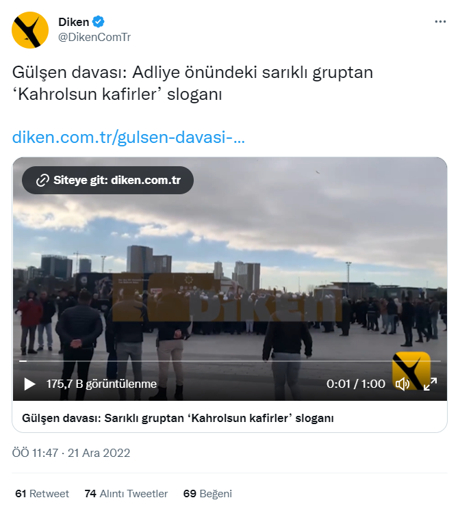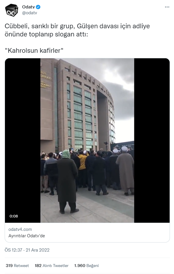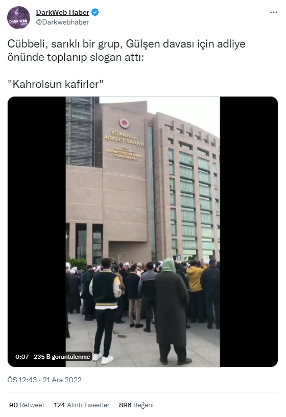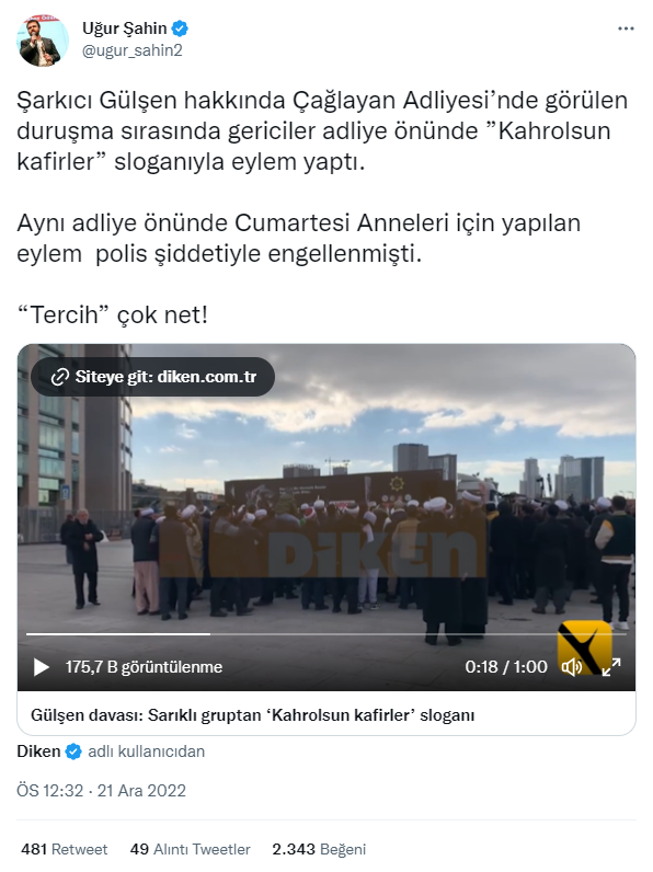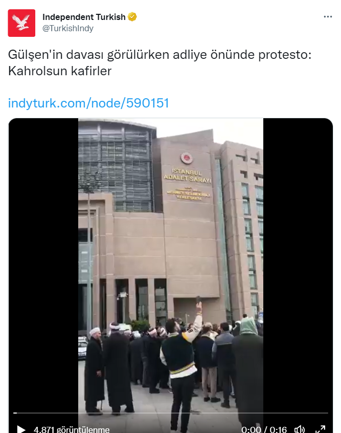 22 Aralık 2022 tarihinde sosyal medyada Çağlayan Adliyesi önünde bir grup tarafından düzenlenen protestonun görüntüleri paylaşıldı. Yapılan paylaşımlarda söz konusu grubun şarkıcı Gülşen’i protesto ettiği belirtildi. İlgili videoyu araştırdık.