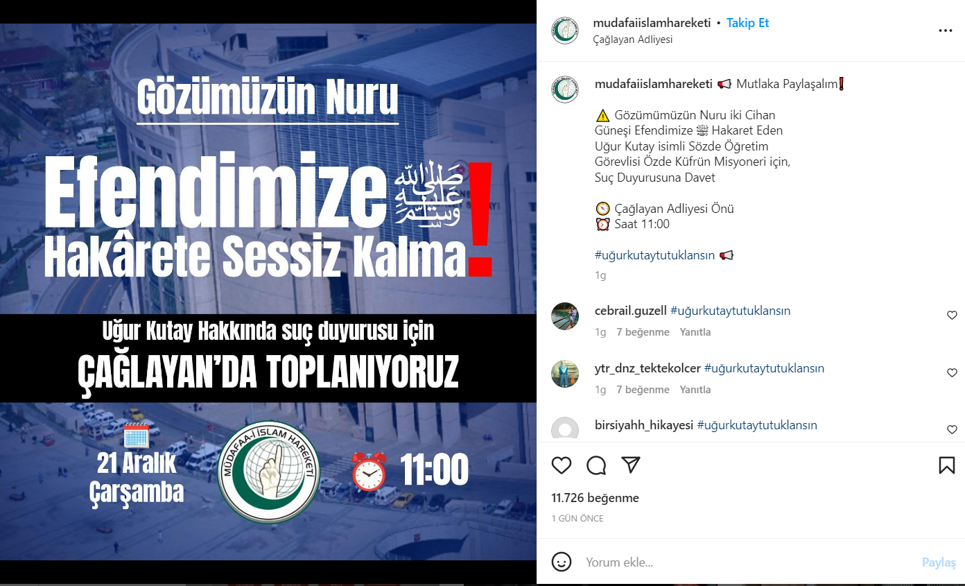 Protestoyu düzenleyen Müdafaa-i İslam Hareketi’nin Instagram hesabında 21 Aralık günü Uğur Kutay hakkında suç duyurusunda bulunmak amacıyla Çağlayan’da toplanılacağına dair paylaşım bulunuyor.
