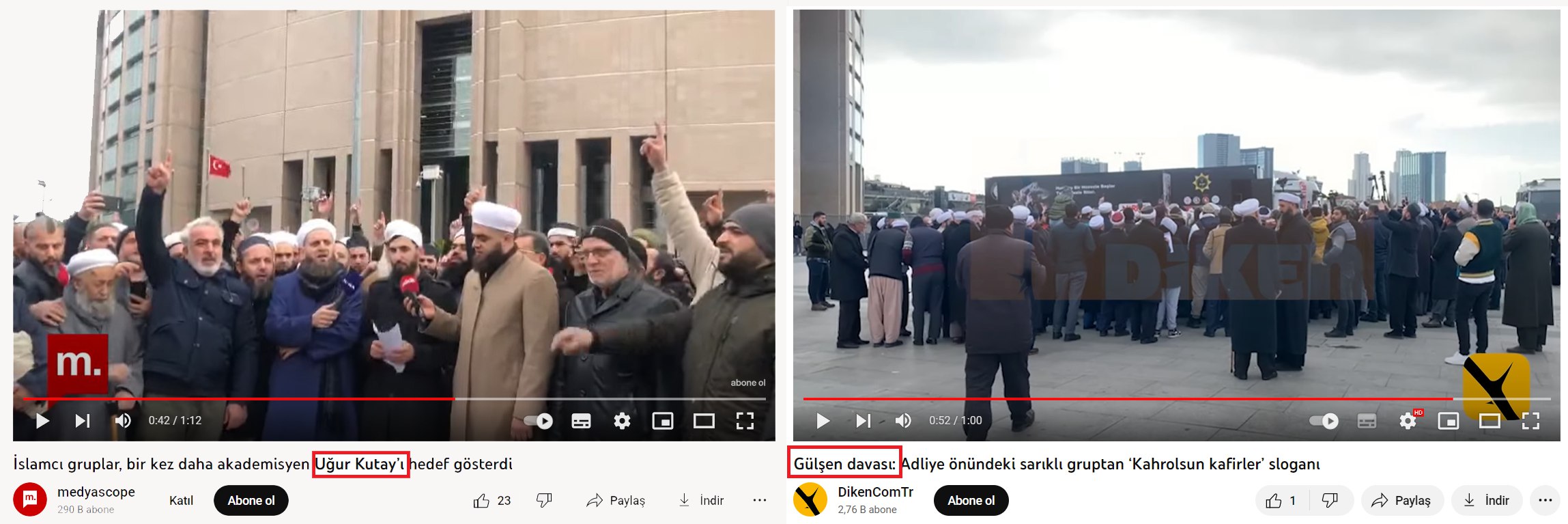 İddia videosunu anahtar kelimelerle araştırdığımızda görüntünün iki farklı açıklamayla paylaşıldığı görülüyor. Videonun, görüntülerdeki kişilerin Uğur Kutay’ı veya Gülşen’i protesto ettiklerine dair iki farklı varyasyonu mevcut.