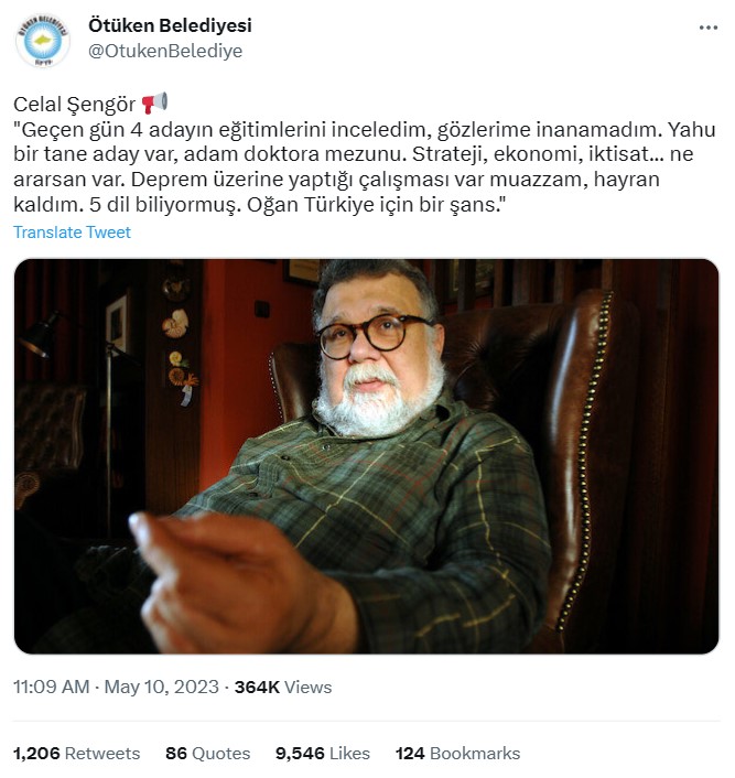 Cumhurbaşkanlığı seçimi için Sinan Oğan Bey’i desteklediğim konusunda Ötüken Belediyesi adı altında benim bilmediğim bir kaynak tarafından yayın yapıldı. Bunun gerçekle hiçbir alakası yoktur. Yapılan düpedüz ahlaksızlık. Benim oyum Kemal Kılıçdaroğlu’na. Başından beri böyleydi, bugün de bunu halkımıza ilan etmek isterim.
