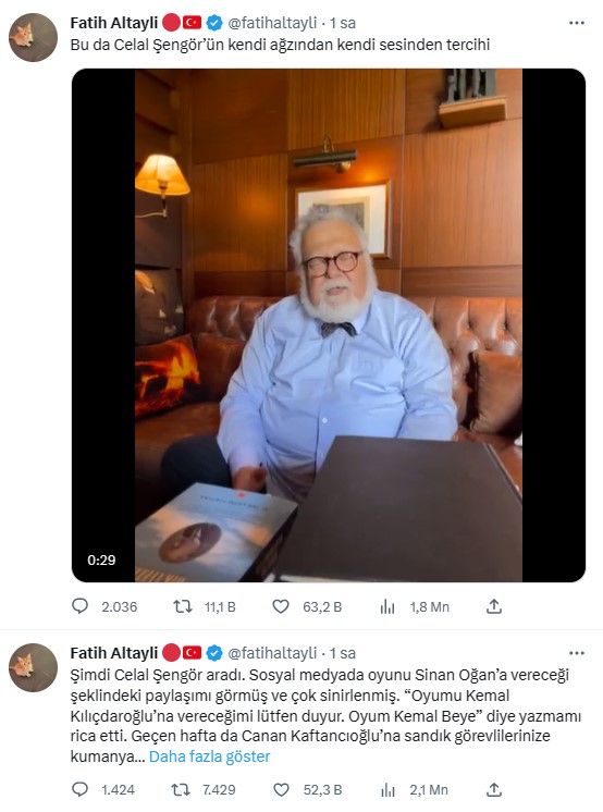Bugün gün içerisinde Şengör, Altaylı aracılığıyla bir video yayınlayarak, hakkındaki iddiaları yalanlamış ve seçimlerde Kemal Kılıçdaroğlu’nu destekleyeceğini şu ifadelerle söylemişti: