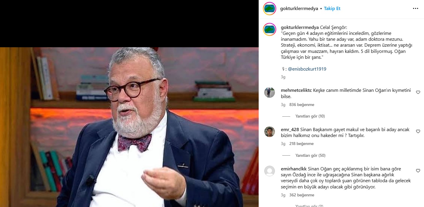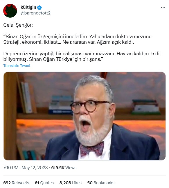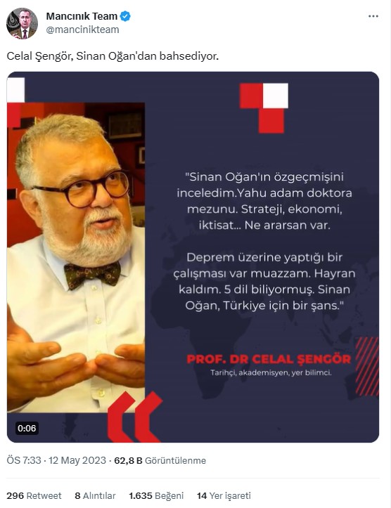 Twiter’da sıklıkla yayılımda olan paylaşıma göre, Prof. Dr. Celal Şengör’ün, mevcut Cumhurbaşkanları adayları içerisinde Sinan Oğan için şu ifadeleri kullandığı iddia edilmişti: