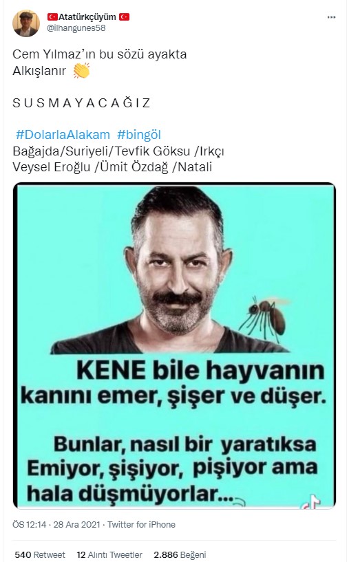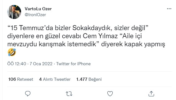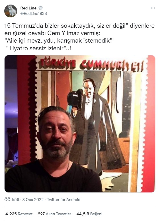 Sosyal medyada ünlü komedyen Cem Yılmaz’a ait olduğu iddia edilen pek çok söz paylaşılıyor. Çoğunlukla siyasi içerikli bu sözlerin bazıları ise 15 Temmuz Darbe Girişimi ile alakalıdır. Cem Yılmaz 8 Ocak 2022 tarihinde bu iddialar ile ilgili bir tweet attı. Cem Yılmaz tweetinde “… Zam, darbe, 15 Temmuz, din gibi konularda bir dörtlük uydurup imza Cem yazıp geçiyorlar. Amaç ne ?” dedi. Bunun üzerine bu iddialar gündem oldu. Cem Yılmaz’a atfedilen pek söz vardır. Bunlardan bazılarını yukarıdaki görsellerden görebilirsiniz.