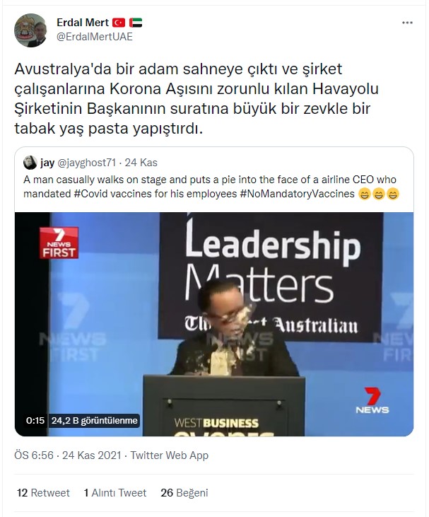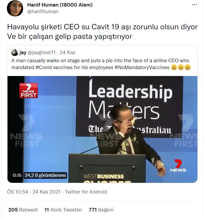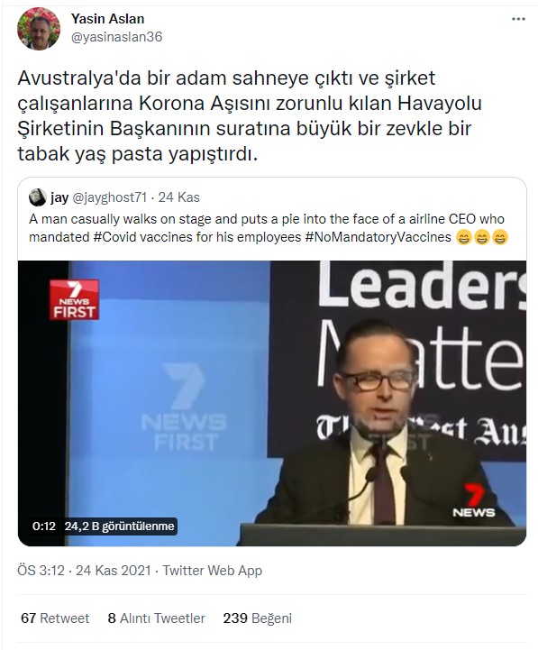 Twitter’da yayılan iddiaya göre bir havayolu şirketi CEO’su Covid-19 aşısını zorunlu olsun derken bir çalışan gelip yüzüne pasta yapıştırıyor. İddia bir video ile paylaşıldı. Videoda gerçekten birisi konuşma yaparken başka birisi gelip yüzüne pasta yapıştırıyor. Bir paylaşım 206 retweet, 11 alıntı tweet ve 768 beğeni almıştır. Diğer bir gönderi ise 67 retweet, 8 alıntı tweet ve 236 beğeni almıştır. 2020 yılı Kasım ayında aynı video ile benzer bir iddia da ortaya atılmış ve bu iddiada yüzüne pasta vurulan CEO’nun havayollarını kullanmak için Covid sağlık pasaportu getirilmesi gerektiğini savunduğu söylendi.