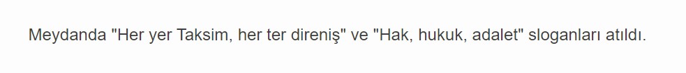 Mitingle ilgili iddiaların ortaya çıkmasından önce BBC, Cumhuriyet ve Sözcü gibi basın kuruluşlarında, meydanda atılan sloganın “Her yer Taksim, her yer direniş” olduğuna vurgu yapıldığını görmek mümkün;