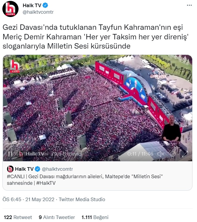 O anlarda Twitter hesabı üzerinden anlık olarak canlı yayın yapan Halk TV’de mitingde “Her yer Taksim, her yer direniş” sloganı atıldığını aktardı.