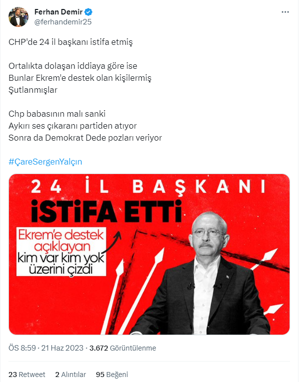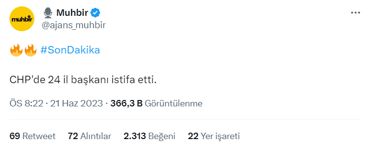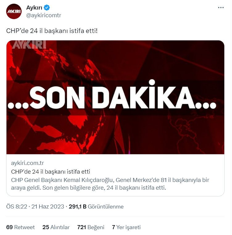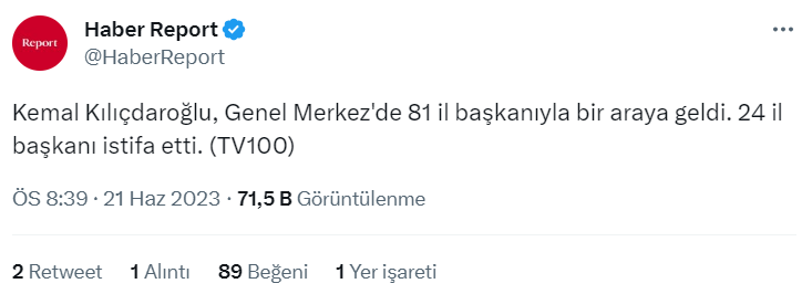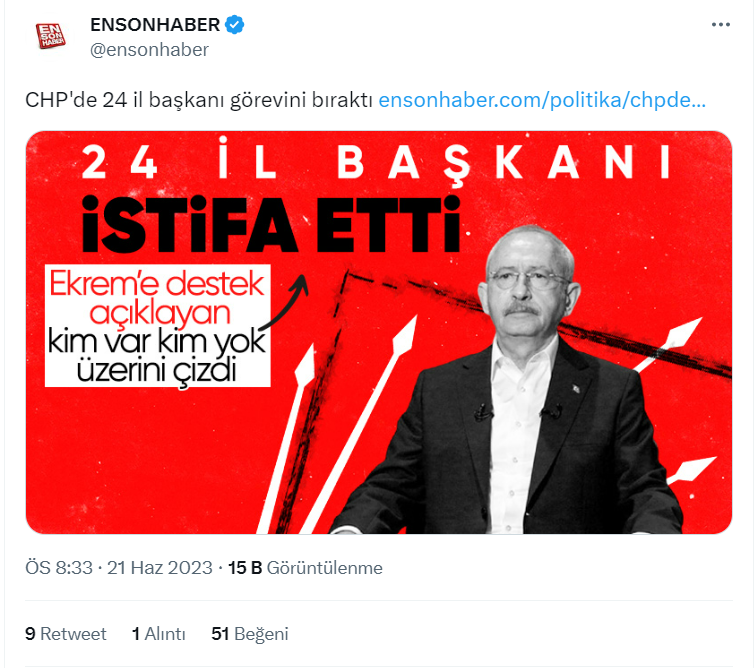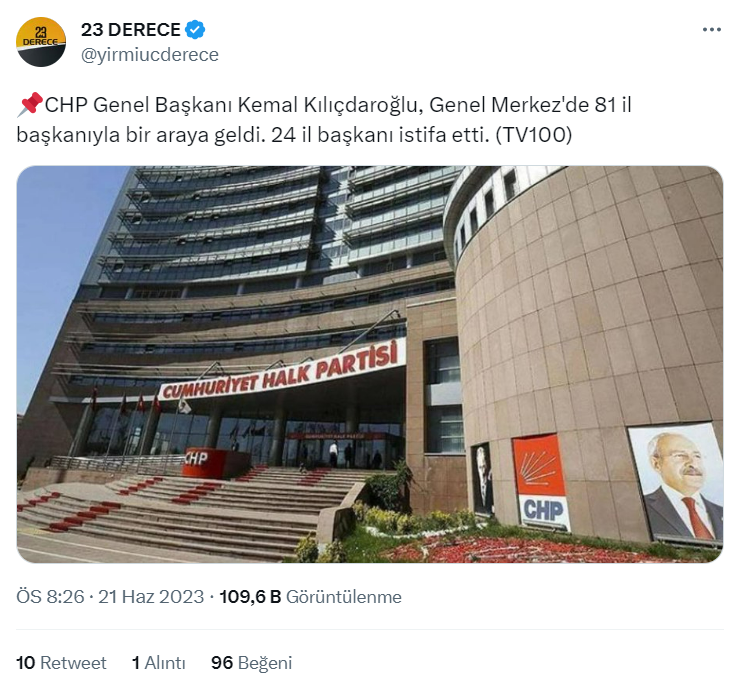 CHP Genel Başkanı Kemal Kılıçdaroğlu, 21 Haziran Çarşamba günü il başkanlarıyla bir araya gelerek bir toplantı düzenledi. Toplantının ardından sosyal medyada bazı kullanıcılar ve haber hesapları CHP’den 24 il başkanının istifa ettiğine dair paylaşımlarda bulundu.