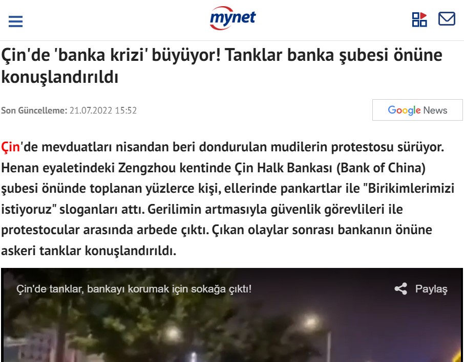 Çin’de gerçekten de bir banka krizi yaşanıyor. Nisanın ayından bu yana bankalardaki paralarını çekemeyen vatandaşlar temmuz başında bu konu hakkında protesto düzenliyor. Bu protestolar Hınan ve Anhui eyaletlerinde yaşanıyor. Çünkü hakkında soruşturulma başlatılan yerel bankalar bu eyaletlerde yer alıyor.