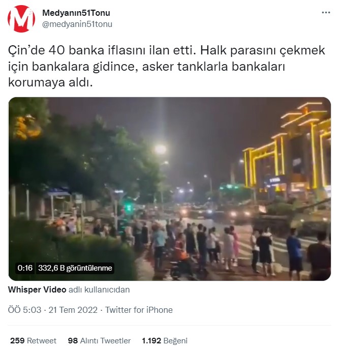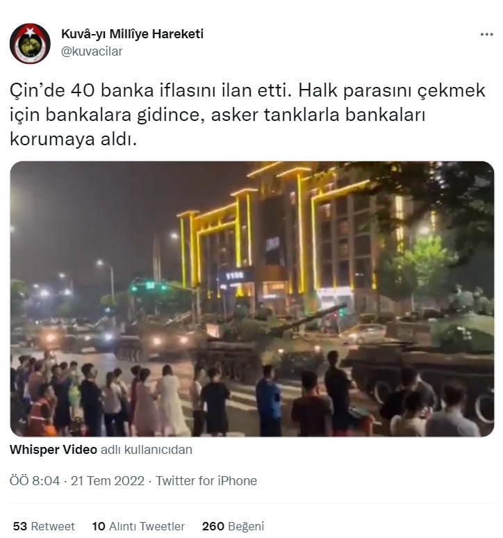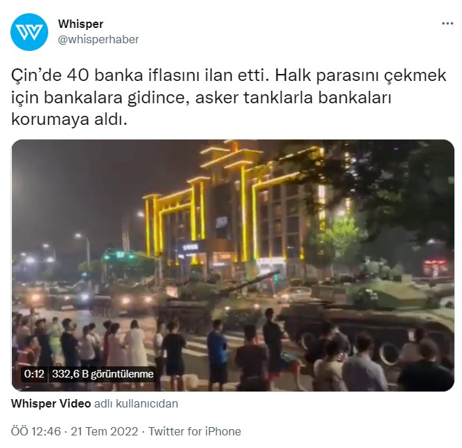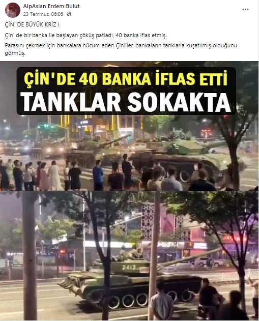 Sosyal medyada, Çin’deki ekonomik kriz dolayısıyla bankaların tanklarla korunduğuna dair bir iddia paylaşılıyor. İddiaya göre ülkede yaşanan banka krizinden dolayı halk paralarını çekmek üzere bankaya gidince tanklarla karşılaşmış.