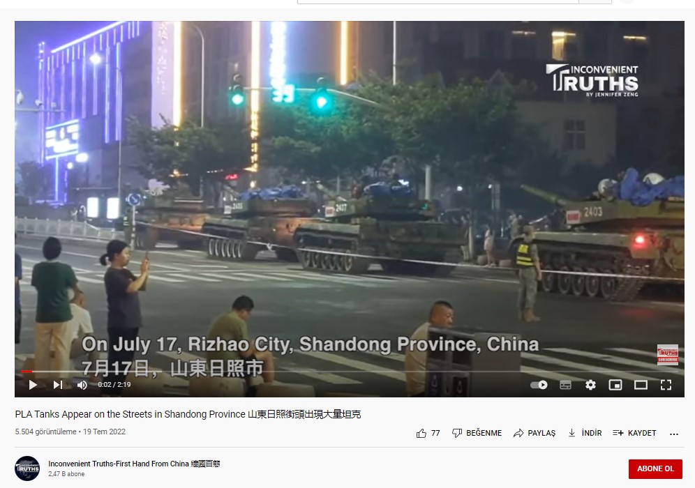 Videoda dikkati tanklardan alıp insanlara yönelttiğimizde gayet sakin olduklarını hatta fotoğraf çektiklerini görüyoruz. Ellerinde pankart yok ve bağırmıyorlar. Ayrıca paylaşılan videonun türevlerinin üzerinde 19 Temmuz 2022, Rizhao City yazıyor.