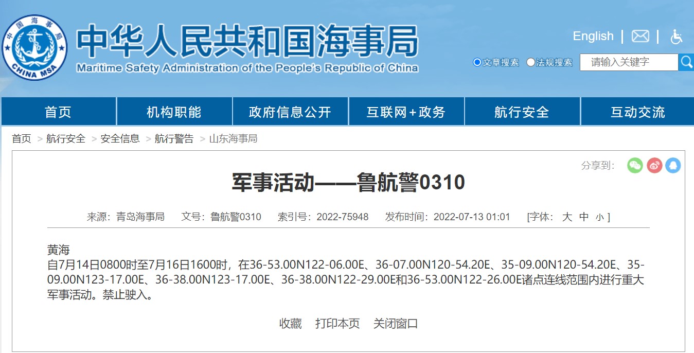 Çin Deniz Güvenliği İdaresi’nin resmi web sitesinde de tatbikatla ilgili uyarı yazısı girilmiş.