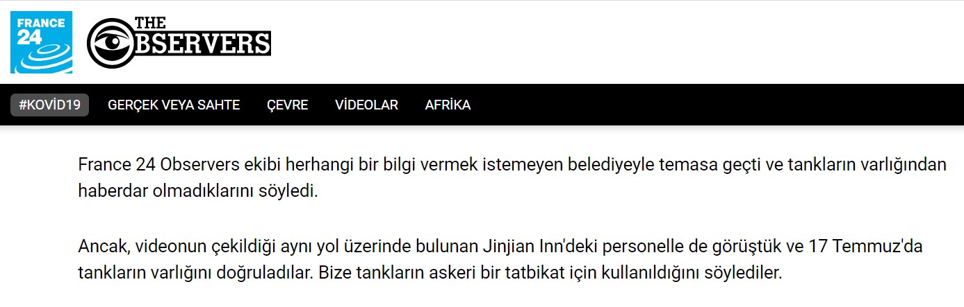 ABD merkezli haber ajansı Associated Press, konuyla ilgili yazısında, Ji Hotel’in resepsiyonundan bir personelle görüştüğünü belirtti. Personel, tankların her yıl gerçekleşen bir askeri tatbikatın parçası olduğunu dile getirmiş. France 24 Observers ekibi de Ji Hotel’in personeli ile görüştüklerini ve tankların askeri tatbikat için kullanıldığını yazmış.