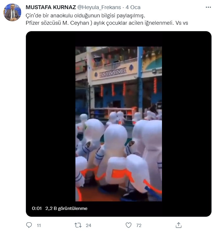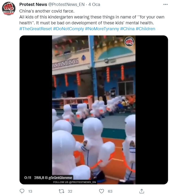Son zamanlarda Twitter’da Türkiye’de ve yurt dışındaki aşı karşıtlığıyla bilinen manipülasyon hesaplarının attığı tweetlerde, bir dizi küçük çocuğun hazmat (tehlikeli madde) giysisiyle grup halinde yürüdüğü görülmektedir.