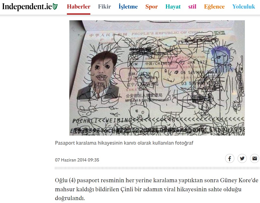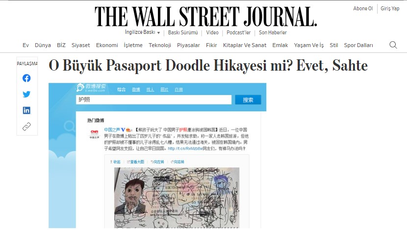 Şüpheyle karşılanabilecek olan bu fotoğrafla ilgili The Wall Street Journal’da yer alan haberi görüyoruz. Haberin detaylarında, konunun Güney Kore’nin başkenti Seul’daki Çin Büyükelçiliği ile temasa geçildiği belirtilmiş. Güney Kore’de böyle bir olayın olmadığını doğrulayan Büyükelçilik yetkilisi, fotoğrafın sahte olduğunu ve Güney Kore’de resmi seyahat belgelerinde çocukların çiziminden kaynaklı olarak seyahatin engellenmediğini söylemiş.