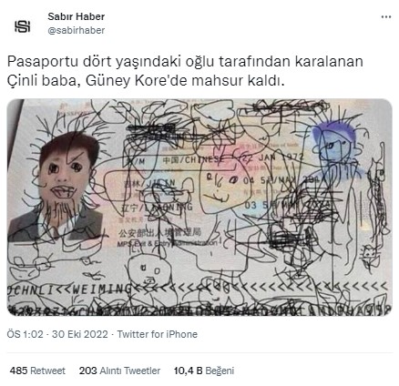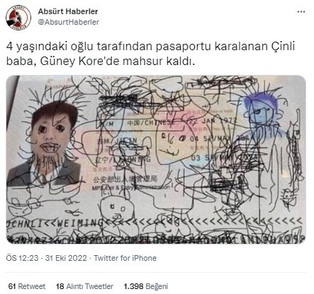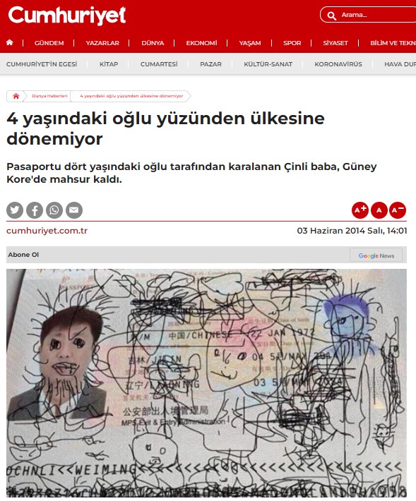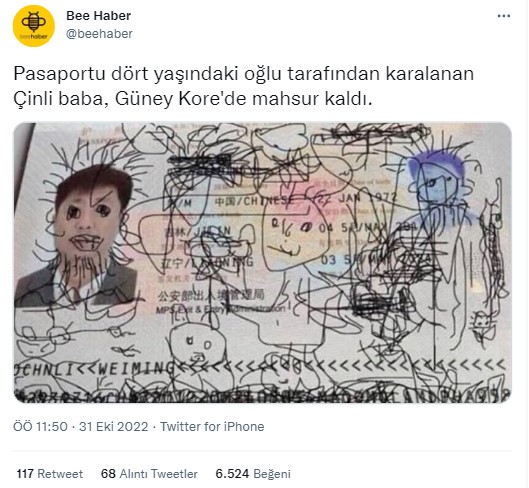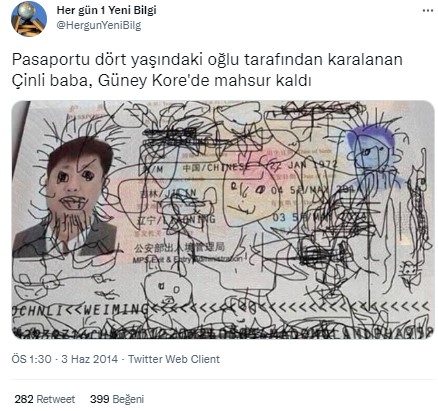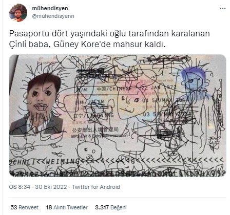 Son günlerde sosyal medyada karşılaştığımız bir paylaşımda, pasaportu dört yaşındaki oğlu tarafından kalemle çizilen Çinli babanın Güney Kore’de mahsur kaldığı öne sürüldü.