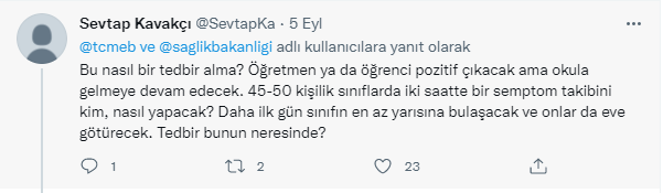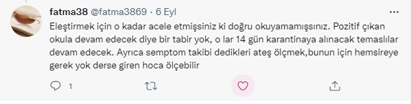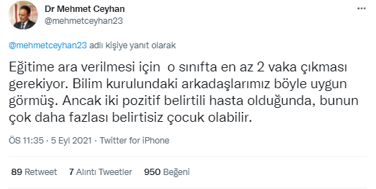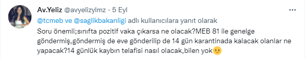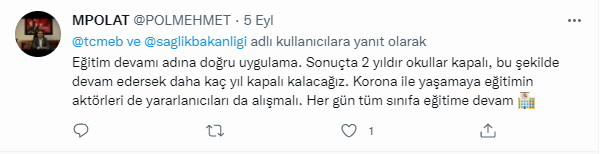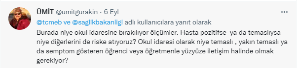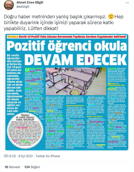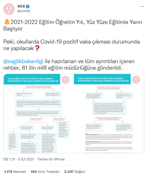 Pandemi sebebiyle 16 Mart 2020 tarihinde ara verilen yüz yüze eğitime 6 Eylül 2021 itibariyle yeniden başlandı. Bu karar kimileri tarafından olumlu karşılanırken kimileri tarafından endişeye sebep oldu. Okullarda alınacak Covid-19 tedbirlerinin ne kadar etkili olacağı, bu tedbirlerin nasıl uygulanacağı ve Covid-19 pozitif vaka çıkması durumunda neler yapılacağına ilişkin konular pek çok tartışmayı beraberinde getirdi. Sosyal medyada da konuya ilişkin farklı iddia ve görüşler dile getirilirken Milli Eğitim Bakan Yardımcısı Prof. Dr. Ahmet Emre Bilgili yapılan bir paylaşım dikkat çekti.