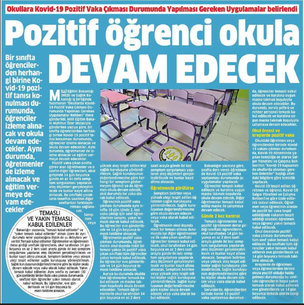 Analiz Gazetesi’nde ‘Pozitif öğrenci okula devam edecek’ başlığı ile verilen haberin içeriğinde Milli Eğitim Bakanlığı tarafından illere gönderilen ‘Okullarda Covid-19 Pozitif Vaka Çıkması Durumunda Yapılması Gereken Uygulamalar Rehberi’ne ilişkin bilgiler yer alıyor. Haberin detayını incelemeden önce bu rehbere bir göz atalım.