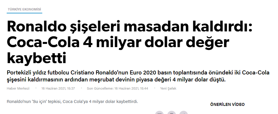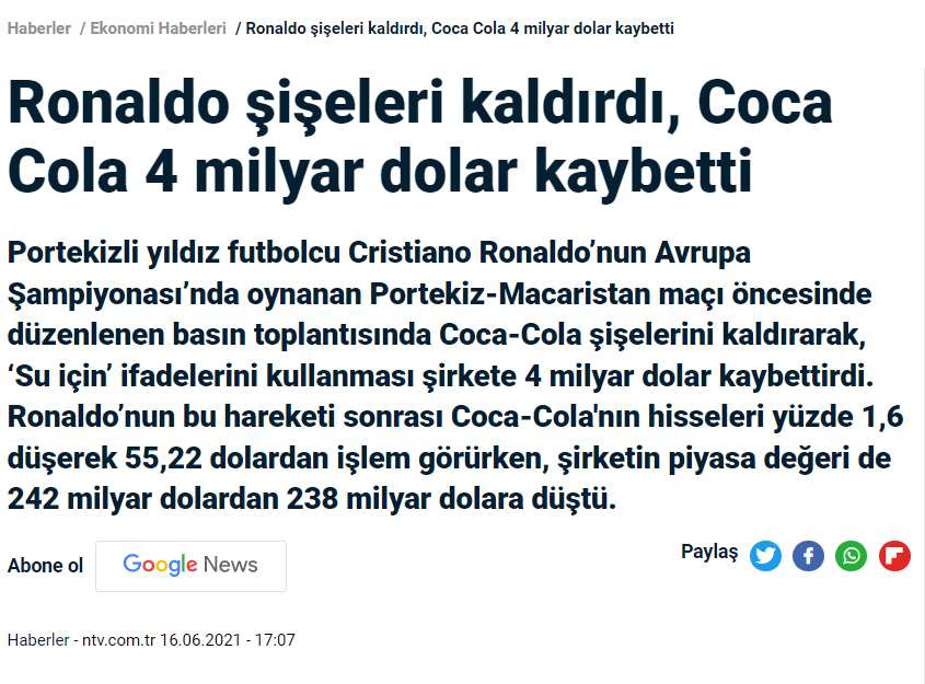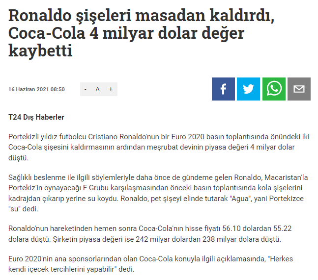 Ünlü isimlerin halk üzerindeki etkisi tartışılmayacak bir gerçek. Söyledikleri herhangi bir sözle ya da sergiledikleri herhangi bir davranışla kitleleri harekete geçirebilmeleri artık sıradan bir olay olarak kabul ediliyor. Bunun en son örneği olarak, Cristiano Ronaldo Portekiz’in Macaristan ile oynayacağı maç öncesi düzenlenen basın toplantısında kameraların karşısına geçti. Ancak bu sefer yaptığı açıklamalarla değil, sergilediği bir davranış ile olay oldu. Masaya oturduğu gibi Coca-Cola şişelerini masadan kaldırıp su şişesini eline alarak “Aqua” yani “Su” diyen ünlü futbolcu izleyenlere su için mesajı verdi. Yerli yabancı medyada haberlere konu olan bu davranış sonrası, gözler Coca-Cola’daki hisselerin değer kaybına çevrildi. Birçok medya kuruluşu tarafından yayımlanan bu hisse kaybı (market cap) değerlerinde Coca-Cola Şirketi’nin piyasa değerinin 242 milyar dolardan 238 milyar dolara gerilediği görüldü. Türkiye’de NTV, Yenişafak, NTVSpor, T24, WebTekno, yabancı olarak TheGuardian ve CNBC gibi birçok büyük medya kuruluşlarının olayla ilgili yaptıkları haberlerde ortak iddiaları, C.Ronaldo’nun hareketinin bir sonucu olarak Coca-Cola Şirketinin 4 milyar dolar kaybettiği şeklindeydi.