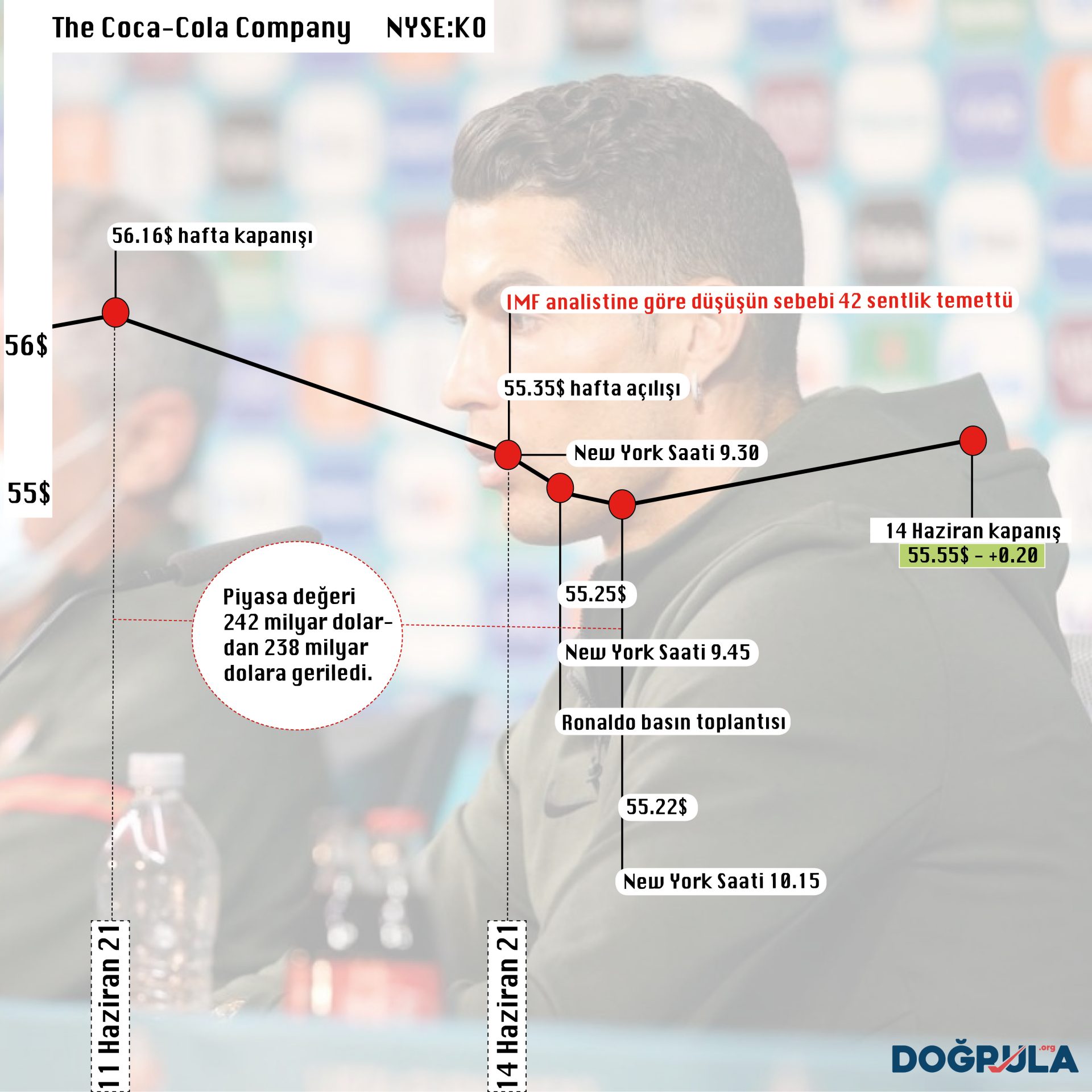 Basın toplantısının başladığı saat olan 09.45 itibari ile 55.25$ işlem gören Coca-Cola hisseleri, Ronaldo’nun Coca-Cola şişelerini kenara koyması ile birlikte geçen günde en düşük olarak 55.22$ seviyesini gördü ve 4 milyar dolar değer kaybına ulaştı.