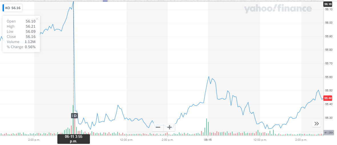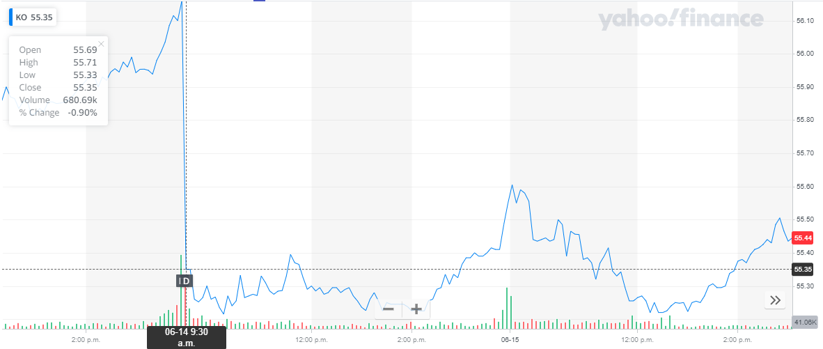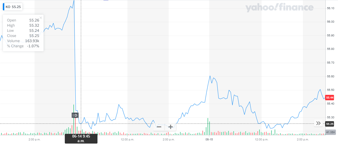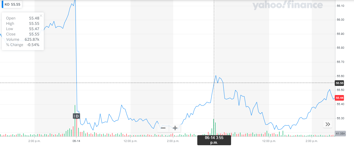 Yahoo Finance‘den alının verilere göre, 14 Haziran 2021 Pazartesi günü New York saati ile 09.45’te başlayan basın toplantısı sırasında Coca-Cola hisseleri hali hazırda düşmekteydi. 11 Haziran 2021 Cuma günü hafta kapanışında ABD borsasında Coca-Cola hisseleri haftayı 56.16$ seviyesinde kapattı.