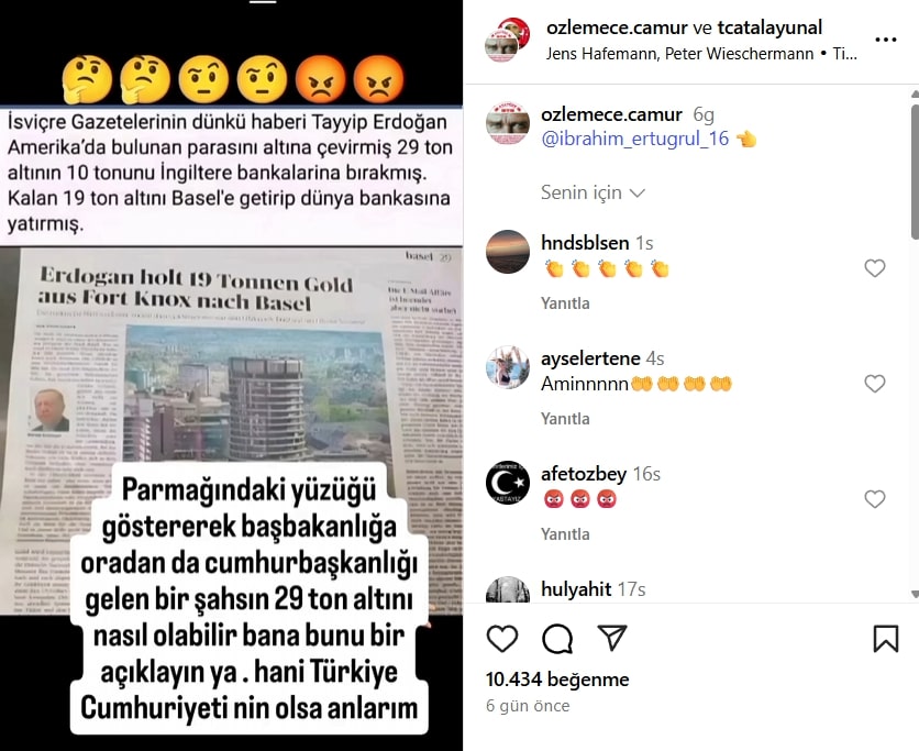 Sosyal medyada uzun süredir dolaşımda olan bir iddiaya göre, Cumhurbaşkanı Recep Tayyip Erdoğan ABD’de bulunan parasını altına çevirdi. İddiaya göre, bu yolla elde edilen 29 tonluk altının 10 tonu İngiltere’deki, 19 tonu ise İsviçre’deki bankalara yatırıldı.