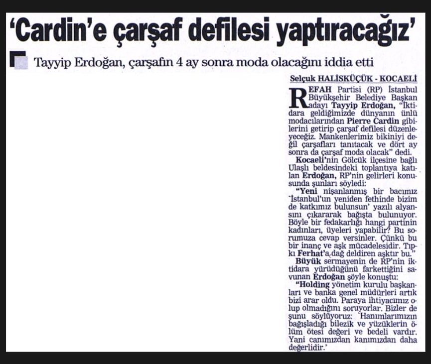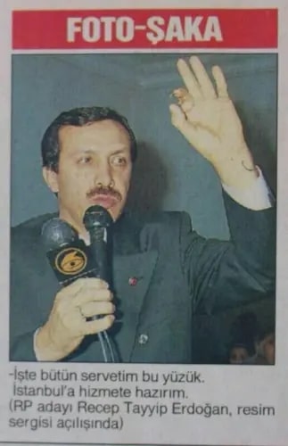 - Erdoğan’ın “Bir yüzükten başka bir şeyim olursa…” dediğine dair hiçbir kayıt veya kaynak bulunmuyor; bu ifade 90’larda gazetelerin mizah köşesi olan “Foto-Şaka” formatındaki uydurma alıntıdan türemiş.