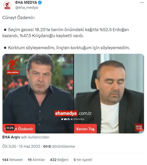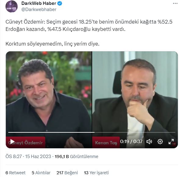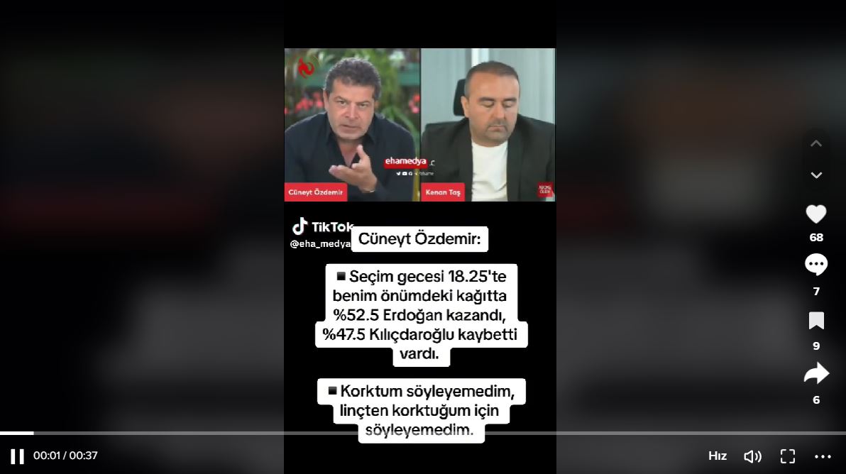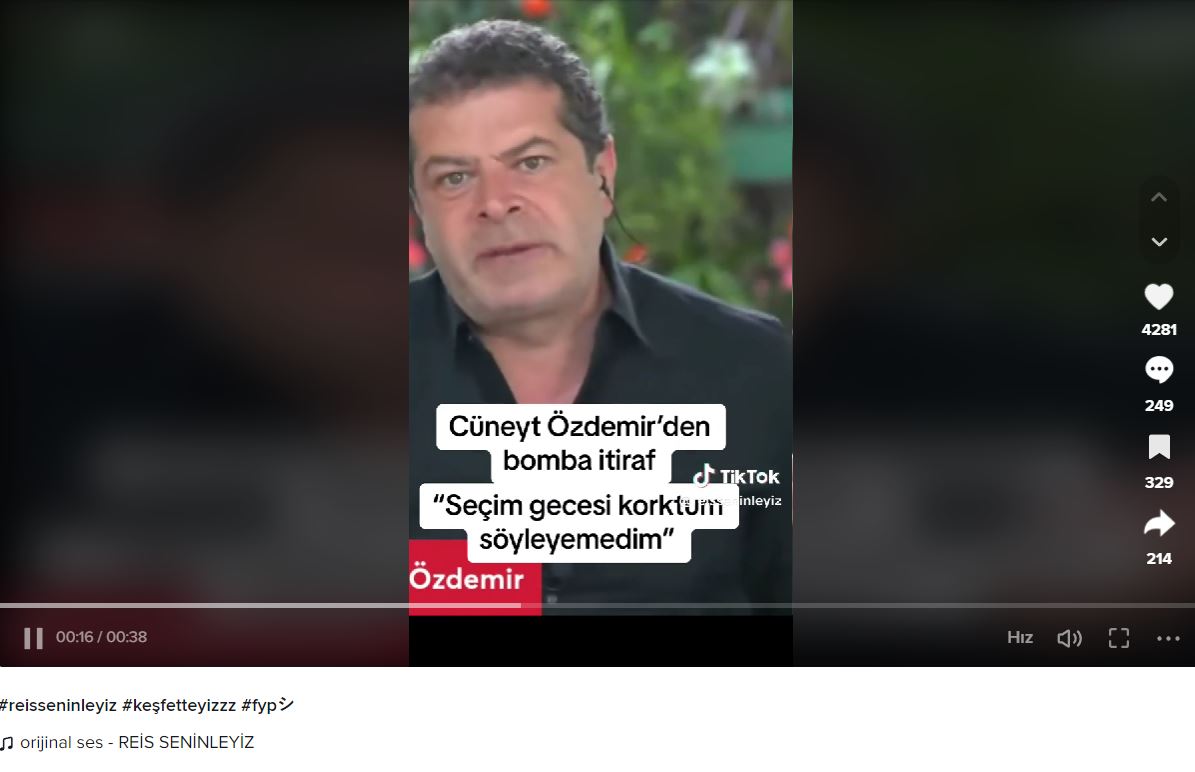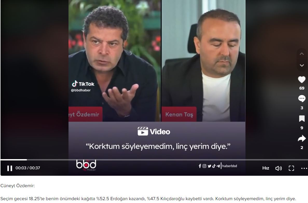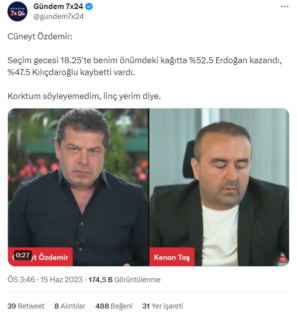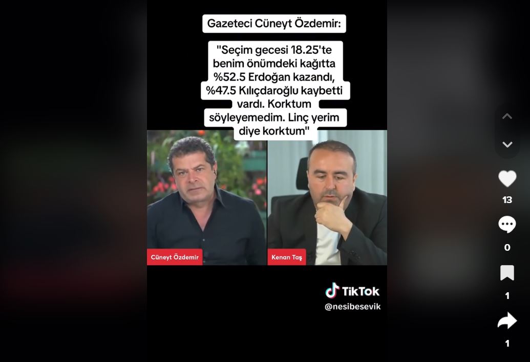Sosyal medyada paylaşılan bir gönderide gazeteci Cüneyt Özdemir’in “Seçim gecesi 18.10’da Anadolu Ajansı sonuçları açıkladı 18.25’te benim önümdeki kağıtta %52.5 Erdoğan kazandı, %47.5 Kılıçdaroğlu kaybetti vardı. Korktum söyleyemedim, linçten korktuğum için söyleyemedim.” ifadelerini kullandığı bir video yayıldı.