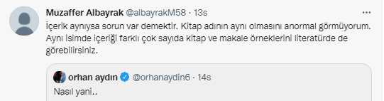 Sosyal medyada Erdoğan’ın kullandığı başlığın daha önce başka bir kitabın başlığı olarak kullanıldığına dair bir iddia ortaya atıldı. Paylaşımlarda bu iddiaya konu olan sözde kitabın kapağı yayınlandı. Kapakta Oktay Doğan’ın ismi ve fotoğrafı yer alıyor. İncelemelerimizin sonucunda bu kitap kapağının Twitter’da Oktay Doğan isimli kişi tarafından mizah amaçlı oluşturulduğu ve paylaşıldığını tespit ettik. Sosyal medyada böyle bir algı oluşmaya başlayınca Oktay Doğan Orhan Aydın’ın paylaşımının altında bu paylaşımın ironi olduğunu belirtti.