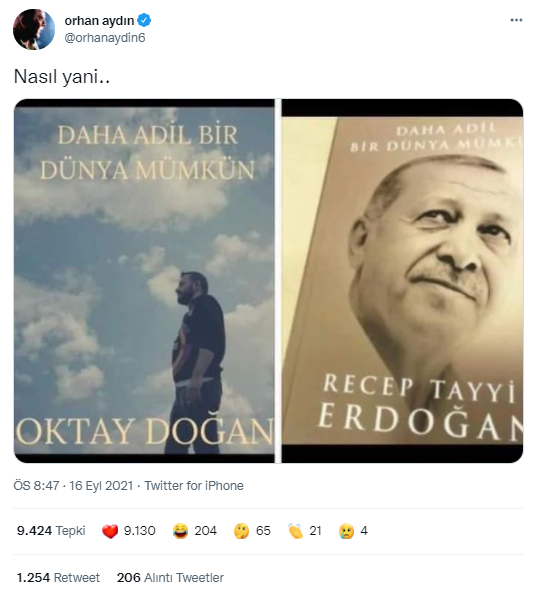 Cumhurbaşkanı Erdoğan’ın kitabına verdiği “Daha Adil bir Dünya Mümkün” isminin Oktay Doğan’ın kitabından alıntı olduğu yönünde paylaşımlar yayılımdaydı. Ancak böyle bir kitap mevcut değil. Kitap kapağı, Oktay Doğan tarafından ironi amacıyla oluşturulmuş bir görsel tasarım.