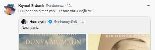 Cumhurbaşkanı Recep Tayyip Erdoğan’ın ‘Daha Adil Bir Dünya Mümkün’ adlı kitabı 6 Eylül’de satışa çıkmıştı. Sosyal medyada da epey yankı bulan kitaba ilişkin tiyatro sanatçısı Orhan Aydın Twitter’da bir paylaşım yaptı.