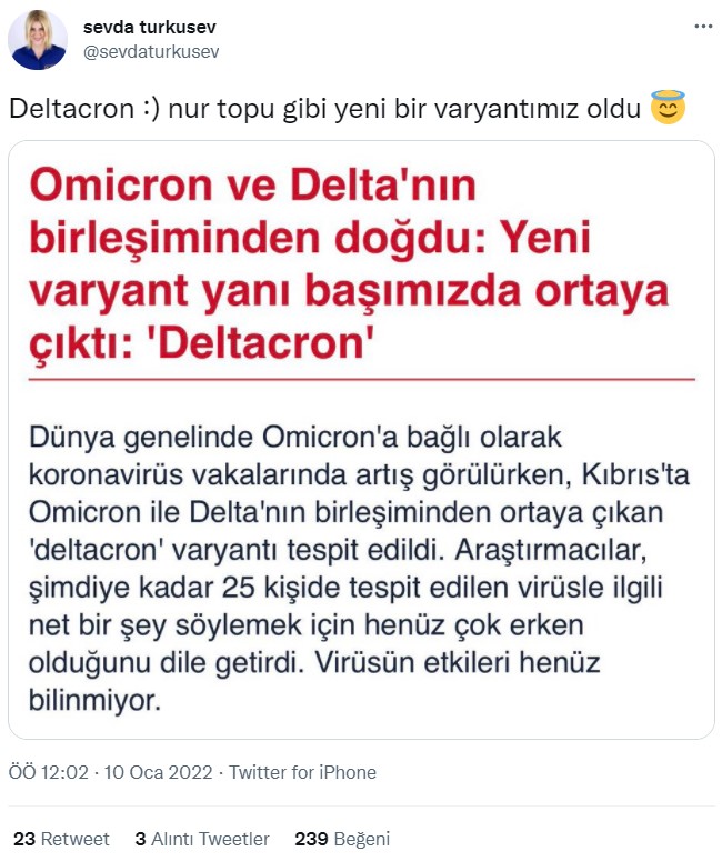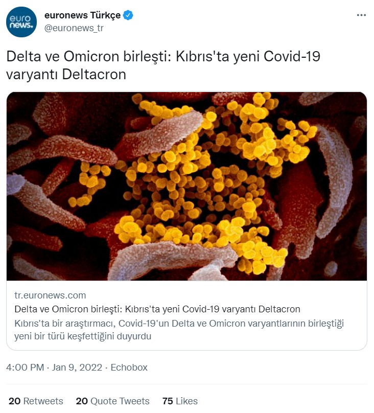 Geçtiğimiz günlerde yine buna benzer birtakım içerikler yayılım gösterdi. Söz konusu açıklamalarda Güney Kıbrıs’ta, Delta ve Omicron varyantının birleşimiyle “Deltacron” isminde yeni bir varyant tipi görüldüğü iddia edildi.