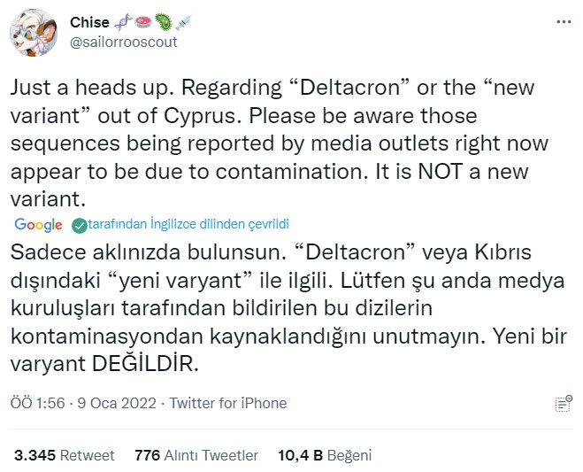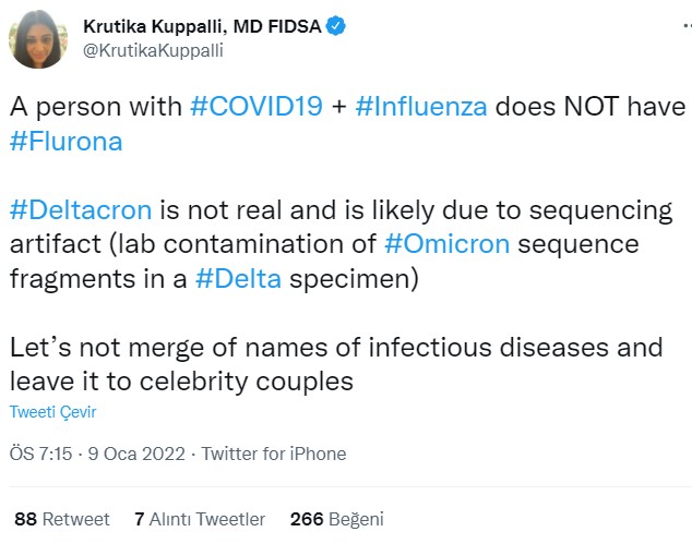 • Dünya Sağlık Örgütü, enfeksiyon hastalıkları doktoru Dr. Krutika Kuppalli’nın onaylı Twitter hesabından Deltacron Varyantının resmi olarak tanınmadığına dair bir açıklamasına da ulaşılabilir.