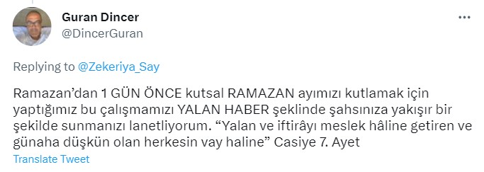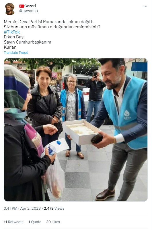 Öncelikle Deva Partisi 28. Dönem Mersin Milletvekili Aday Adayı Güran Dinçer, Zekeriya Say’ın paylaşımına verdiği cevapta 22 Mart’ta yapılan paylaşımın görselini ekleyerek etkinliğin Ramazan’dan 1 gün önce, Ramazan ayını kutlamak adına yapıldığını belirtmiş. Deva Partisi Genel Başkan Yardımcısı Mehmet Emin Ekmen ise, Güran Dinçer’in cevabını paylaşarak Deva Partisi’nin Ramazan’da lokum dağıttığı iddiasının bir iftira olduğu imasında bulunmuş.