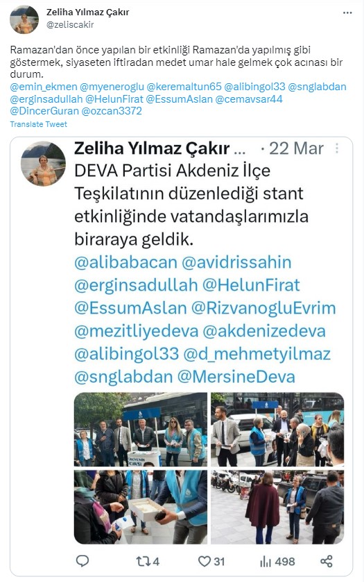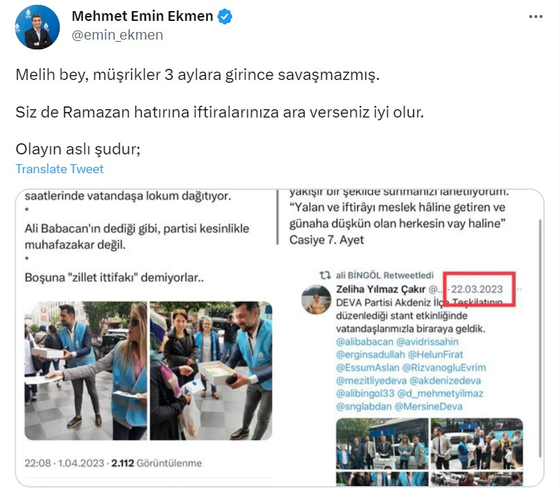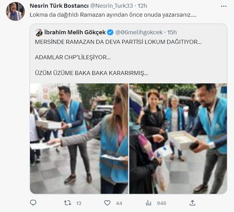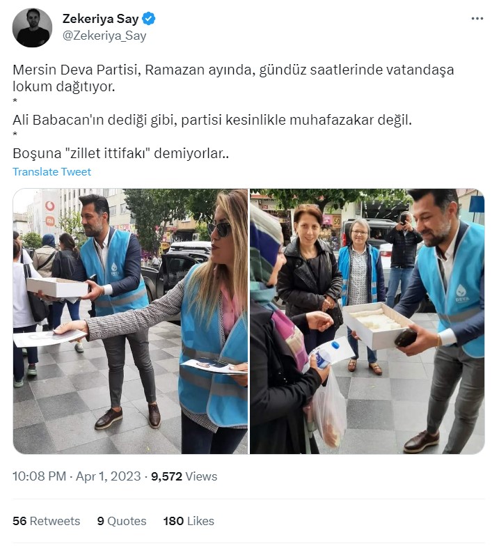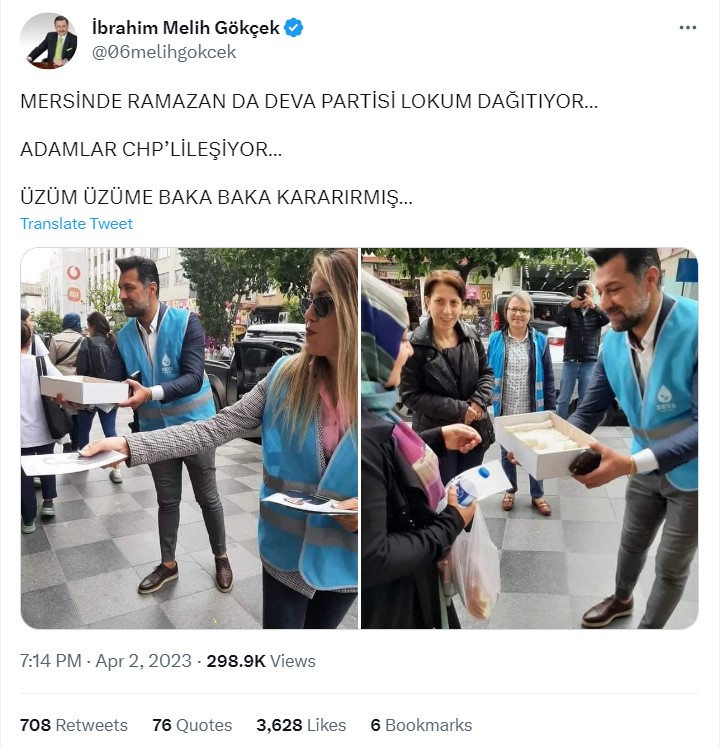 Sosyal medyayı yoğun olarak kullanan Ankara Eski Büyükşehir Belediye Başkanı Melih Gökçek geçtiğimiz günlerde ortaya yeni bir iddia attı. Gökçek, Deva Partisi yeleği giymiş kişilerin lokum dağıttığı görüntüleri paylaşarak Mersin’de Ramazan ayında sokakta lokum dağıtılmasını eleştirdi. İddiayı Yeni Akit yazarı Zekeriya Say da paylaştı.