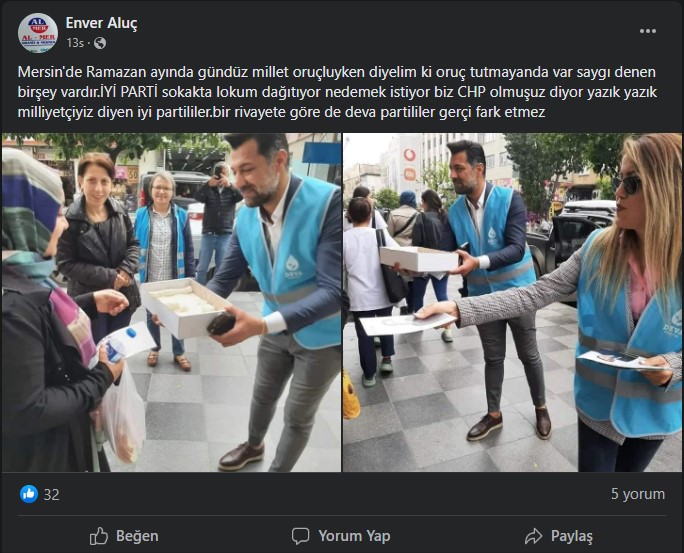 Ek olarak, Akdenizedeva isimli Facebook sayfasından yapılan açıklamada da görselin oruçtan 1 gün önce 22 Mart 2023’te valilik izniyle ilçe teşkilatının düzenlediği etkinlikte kaydedildiği ifade edilmiş. Üstelik benzer bir görselin kaydedildiği tarih de ek bilgi olarak açıklamada kullanılmış.