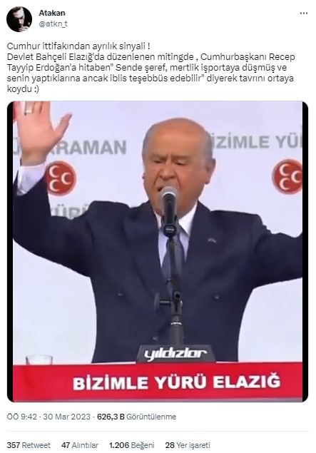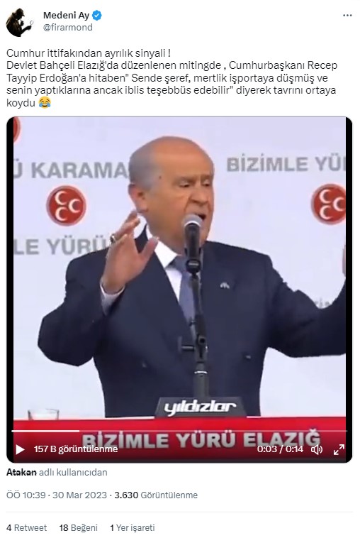 Videoda Bahçeli’nin, “Sayın Erdoğan, şimdi kulaklarını aç ve en azından bizi dinle. Sende şeref ve mertlik işportaya düşmüş. Senin yaptıklarına ancak iblis teşebbüs edebilir.” sözleri yer alıyor.