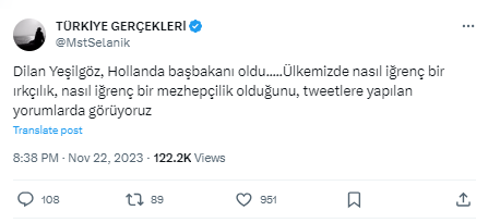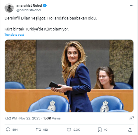Dolayısıyla Yeşilgöz, sosyal medyanın gündeminde sıklıkla yer alıyor. Dün (22 Kasım 2023) gerçekleşen seçimler sonucu Dilan Yeşilgöz’ün Hollanda’nın yeni başbakanı olduğu iddiası sosyal medyada paylaşıldı ve hızla yayıldı. İddiayı paylaşan isimlerden biri de bağımsız gazeteci İbrahim Haskoloğlu’ydu.