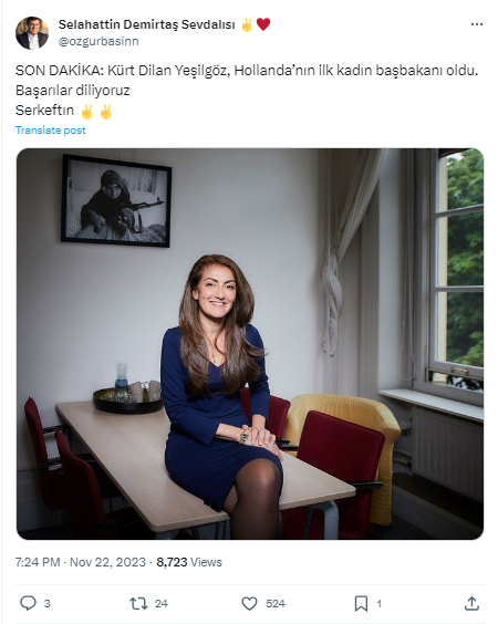 Daha önce de belirtildiği gibi, Dilan Yeşilgöz’ün Hollanda’nın yeni başbakanı olduğu iddiası X Türkiye gündeminde saat 15.11 itibarıyla takip edilebiliyor. Bağımsız gazeteci İbrahim Haskoloğlu da bu iddiayı paylaşan ve yayılımı artıran hesaplar arasındaydı.